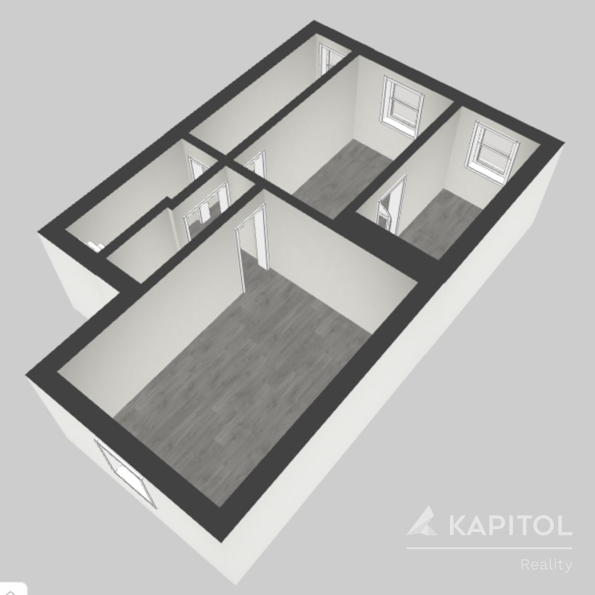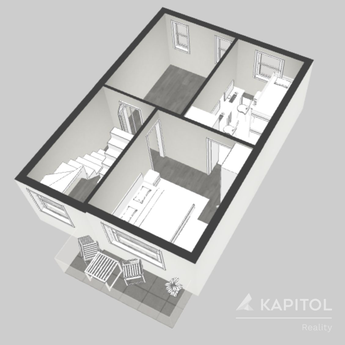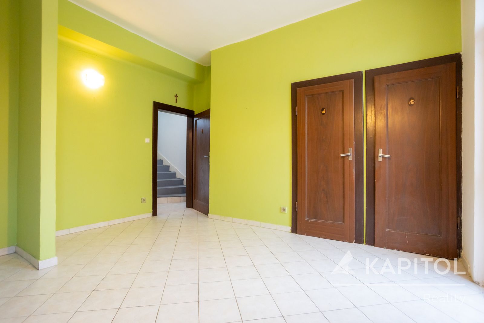 V přízemí je umístěn obývací pokoj, kuchyně, koupelna s vanou, samostatné wc, komora a z kuchyně je vstup na zahradu. Prostor se dá v případě rekonstrukce propojit, kuchyni lze spojit s obývacím prostorem, případně lze zvětšit koupelnu a zrušit komoru.… více